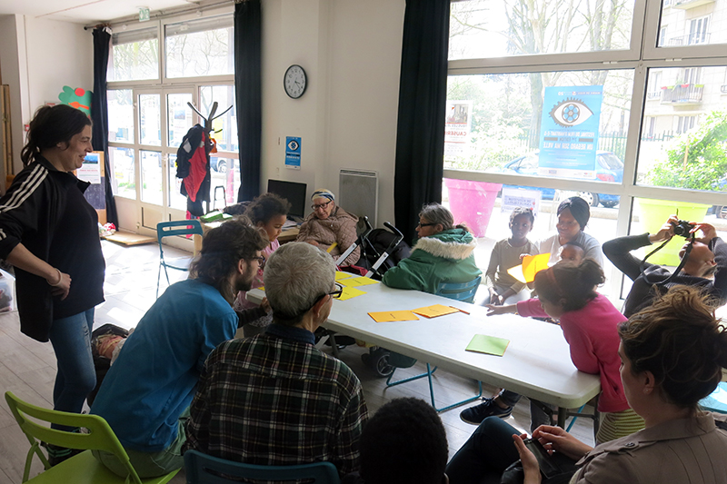 Depuis le mois de mars 2017, Luca Wyss travaille sur le quartier des Fougères – Le Vau avec différentes structures de ce territoire : la Maison des Fougères, le Cap de Bonne Espérance, l’Espace Paris Jeunes Mahalia Jackson, la Cabane Fleury et le collège Pierre Mendès-France. Dans chacun de ces lieux l’artiste propose des ateliers avec les différents publics qui les fréquentent. Au début, il s’est agi d’imaginer des récits sur le futur du quartier. Comment sera le quartier dans 20 ans ? Comment serons nous dans 20 ans ? En jouant les ethnologues du futur, les participants se sont interrogés les uns aux autres. Puis ces histoires on été mises en images (photo, vidéo, dessin, collage…), mais pas par le même groupe qui les a produites ! L’artiste fait circuler les récits d’un lieu a l’autre. Ainsi, par exemple, un groupe de collégiens se retrouve à faire des petits films sur le monde imaginé par les adultes usagers de la psychiatrie du Cap de Bonne Espérance.